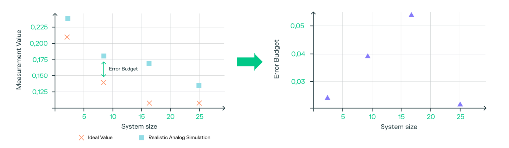 As an algorithm we choose the simulation of quench dynamics. This involves mimicking the behaviour of a quantum system of interest left to evolve out of equilibrium and can tell us about properties of the system, which we might otherwise not have controlled access to. For example, by mimicking how electrons move in a material when it’s heated or disturbed, we can uncover hidden quantum behaviours that are difficult to access through direct measurement. There is precedent for this being one of the most promising avenues for quantum advantage, as it most closely aligns with what analog quantum hardware is good at and is intrinsically hard to simulate classically. In order to quantify how good our neutral atom quantum hardware would be at this task we implement the algorithm perfectly by emulating it without noise to obtain the ideal result and then repeat the implementation using the analog mode of a realistic quantum device (i.e with noise). We choose an observable to measure and compare the value at the end of the simulations to the true value obtained without noise. This enables us to quantify how “well” our realistic device performs. We call the difference between the true value and the value from the realistic analog device the error budget.